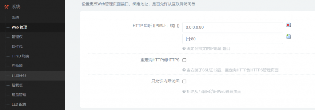 OpenWrt系统默认是不允许从公网访问的,所以我们首先要解除这个限制,登录OpenWrt系统,进入系统-web管理,将只允许内网访问的对勾取消,保存&应用。 解除公网访问限制之后,我们还需要建立一个端口转发服务,以便将我们的网络服务转发到不常用的端口上。