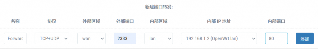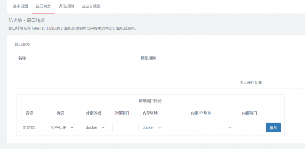 点击网络-防火墙,在屏幕上方就能看到端口转发了,名称和协议可以不用管,转发的外部区域是wan口,因为我们的目的是从公网进行访问,外部端口自己看着喜欢设置,内部区域为lan口,内部IP地址就是我们OpenWrt的管理地址,内部端口为常用端口80.