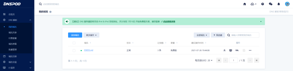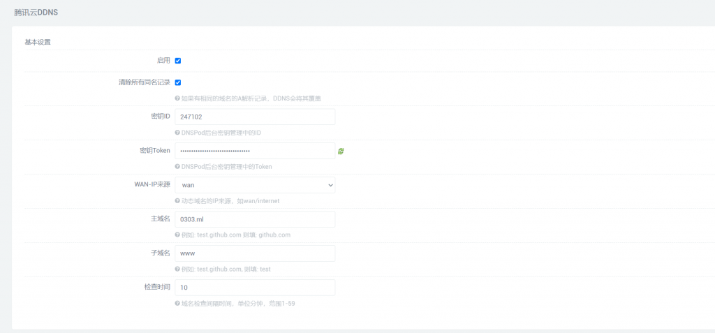 我们来到网络-腾讯云DDNS(用的esir固件,其他固件可能是服务-腾讯云DDNS),要想进行动态域名解析,我们首先得有个域名,腾讯云阿里云都有几块钱一年的域名,实在不愿意花钱的可以上freenom注册一个免费域名,注册完成之后将域名添加到DNSPOD,也就是把域名的dns改为腾讯云的(这一步通常需要24小时才能生效)