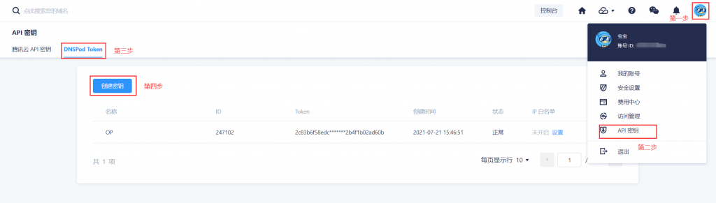 回到腾讯云DDNS这里,密钥ID和密钥token均来自以下操作